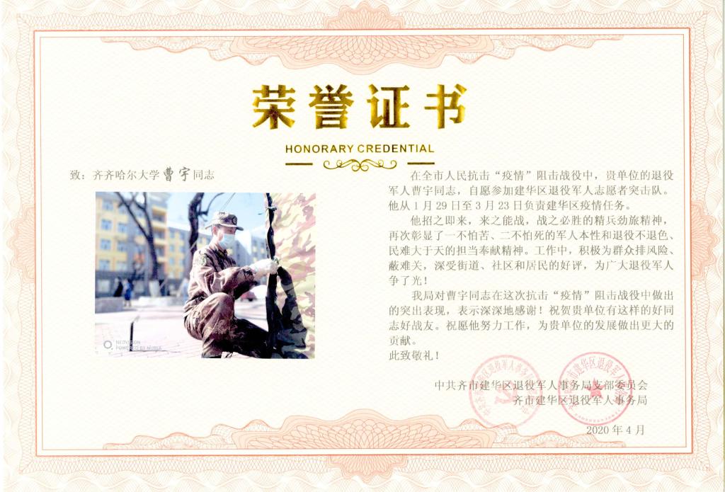 曹宇平日在校時就樂于助人,無私奉獻,在國家和人民有難時又挺身而出,攻堅克難,他的事跡也被更多人知曉。鑒于他在此次疫情防控阻擊戰(zhàn)中的突出表現(xiàn),中共齊齊哈爾市建華區(qū)退役軍人事務(wù)局支部委員會授予了他優(yōu)秀志愿者徽章與榮譽證書。他在得知自己獲得這份殊榮時說道:“雖然證書上寫的是我的名字,但榮譽背后有著更多無名英雄的汗水與努力。作為一名黨員,一名接受了高等教育的退伍軍人,黨和國家培養(yǎng)了我,在危難之際我就應(yīng)該沖上前去。”