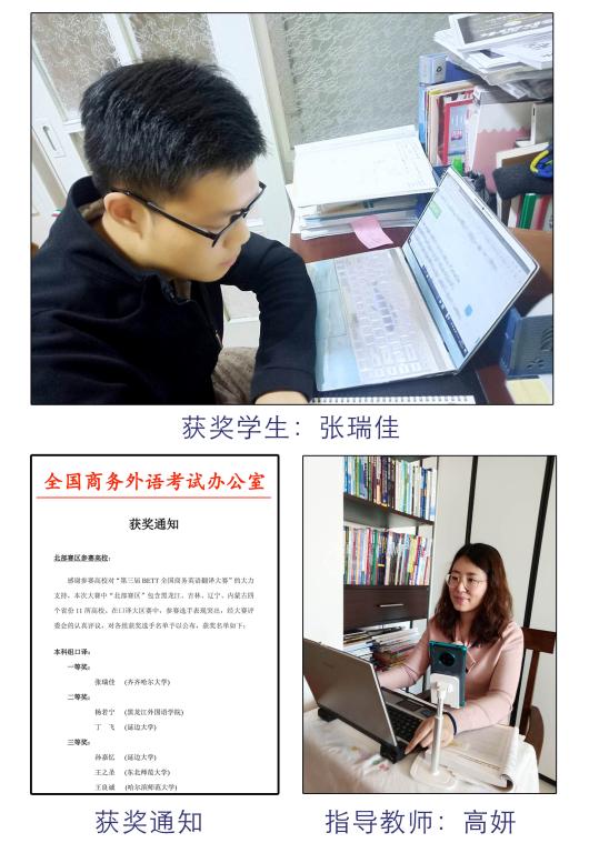 據指導老師高妍副教授介紹,早在2020年1月,外國語學院就派出了7名同學參加了該賽事黑龍江賽區的筆譯和口譯復賽,并全部獲獎。這次口譯大區賽共有來自黑龍江省、吉林省、遼寧省和內蒙古自治區的11所高校參賽。我校學生張瑞佳與東北師范大學、哈爾濱師范大學等高校的學生同臺競技,斬獲了唯一的一等獎。這次獲獎代表著我校英語專業應用型建設取得了可喜的成果,更體現出我校學生在疫情防控期間積極向上的精神風貌。