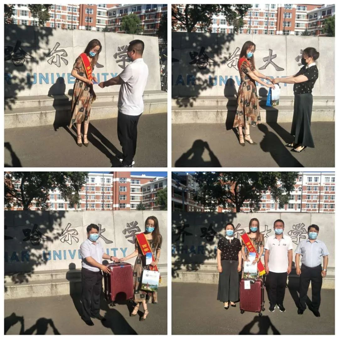 為了表達對西部計劃志愿者們的崇高敬意和殷切期望,校團委于7月20日下午在中區校門口舉行西部計劃志愿者線下歡送儀式。校團委書記孫大鵬、副書記計紅、馬小華出席本次活動,與西部計劃志愿者代表、原校學生會宣傳部副部長、外國語學院孫寧同學(家住齊市建華區)充分交流,并代表學校西部計劃項目辦為志愿者代表披掛綬帶,贈與旅行箱包和帶有學校標識的水杯、記事本、明信片、校徽等紀念品。