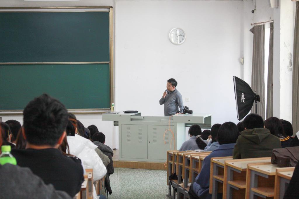 講座中,李賀老師以《用鏡頭發現新聞中的美》為主題,為大家簡要介紹了光的運用、光圈改變的技巧、如何利用角度拍攝照片等內容。他還結合自己以往拍攝的照片為大家介紹了大光圈、長焦距拍攝效果的對比注意事項。全場同學們跟隨著李老師的講述,身臨其境般感受著他多年從事新聞攝影工作的心路歷程和創作經歷。