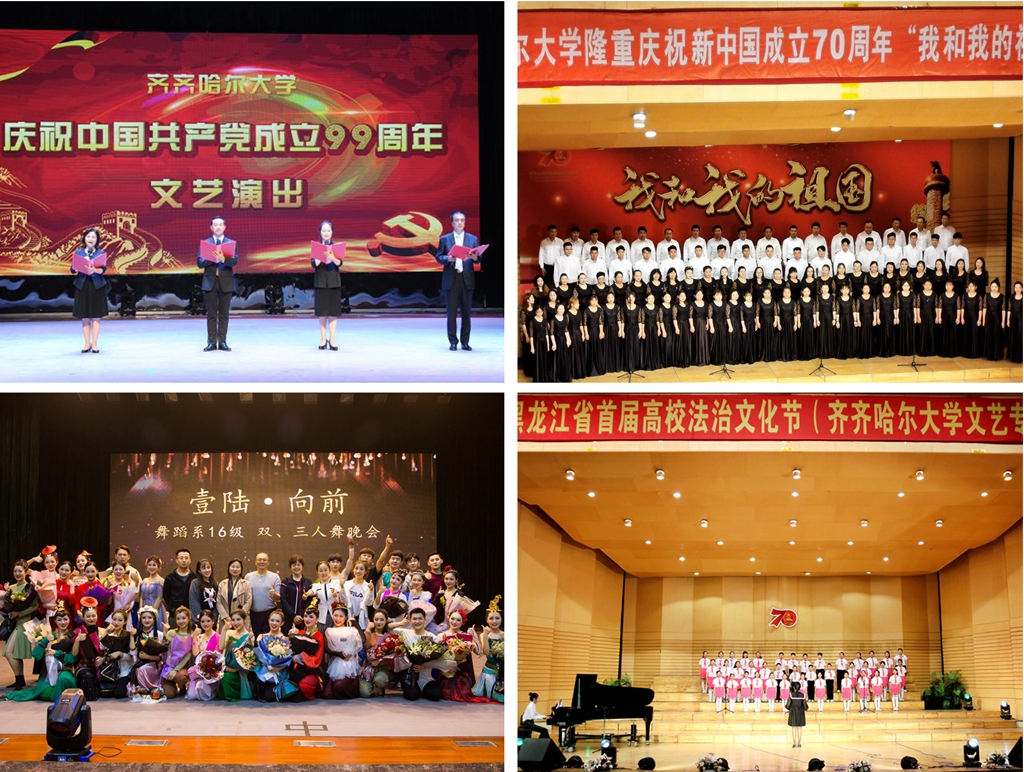 實踐教學一直是音樂與舞蹈學院人才培養的特色,經過多年積淀,通過學校交響樂團、合唱團、舞蹈團等藝術團體為學生提供了輔助教學的實踐主陣地,并以此為依托,通過各種演出活動向外輻射延伸。在實踐教學的各項活動中,根據不同主題,精心設計安排,實現了實踐教學課程思政的體系化。一是承擔黑龍江省高雅藝術進校園系列活動,帶領學生先后走進各類高校巡演,以思想精深、藝術精湛、制作精良為原則,為學生獻上具有鮮明時代烙印的精品力作,傳遞中華文化精髓,培養同學們的人文精神;二是與部隊、公安、社會團體簽訂共建協議,帶領學生走進相關單位進行慰問演出和參觀、交流學習,以“同呼吸、共命運、心連心”為原則,學習軍人優良的作風,培養學生的紀律意識和責任擔當;三是主動承擔城市文化建設重任,以豐富人民文化生活,傳遞社會正能量為原則,先后排演了清唱劇《江姐》、原創音樂劇《一個真實的故事》、交響樂《江橋·1931》、交響組曲《疫·情》等劇目,為市民提供高雅藝術的同時,培養學生的愛國主義精神;四是深挖第二課堂潛力,支持學生藝術社團活動,以充分發揮學生藝術創造力為原則,尊重學生的藝術想象力,鼓勵、認可學生的藝術創作結果,并為他們提供表演舞臺。周末小舞臺學生主創社團近五年來已在校內外持續演出200余場,培養了學生的專業能力和奉獻精神。僅2019年一年就完成重要演出20場,包括慶祝“七一”、慶祝“新中國成立70周年”、“迎新生”、“高雅藝術進校園”省內高校巡演、“消防宣傳日”、“黑龍江省首屆高校法治文化節”、“黑龍江之冬”國際藝術節系列活動“我和我的祖國”、2020民族管弦樂新年音樂會等。