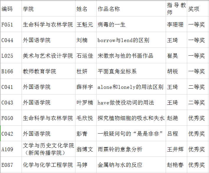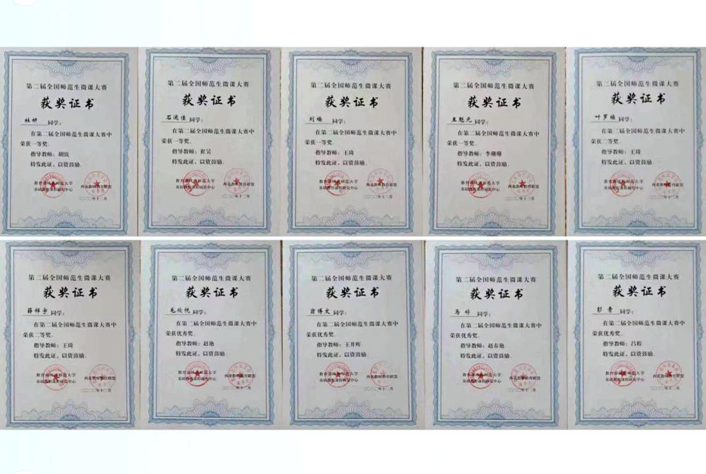 為加快我校師范類學(xué)生教學(xué)綜合能力培養(yǎng),推進(jìn)高素質(zhì)教師隊(duì)伍建設(shè)和精品課程建設(shè),普及信息化教學(xué)手段,促進(jìn)信息技術(shù)與教育的深度融合,探索微課在課堂教與學(xué)創(chuàng)新應(yīng)用中的有效模式,促進(jìn)優(yōu)質(zhì)教育資源共建共享,按照“全國第二屆師范生微課大賽”組委會(huì)要求,我校經(jīng)過嚴(yán)格評(píng)審,遴選優(yōu)秀微課作品參加了全國第二屆師范生微課大賽決賽,近日決賽成績公布,我校共有十名選手脫穎而出,其中四名學(xué)生榮獲大賽一等獎(jiǎng),兩名學(xué)生榮獲大賽二等獎(jiǎng),四名學(xué)生榮獲大賽優(yōu)秀獎(jiǎng)。具體獲獎(jiǎng)信息如下: