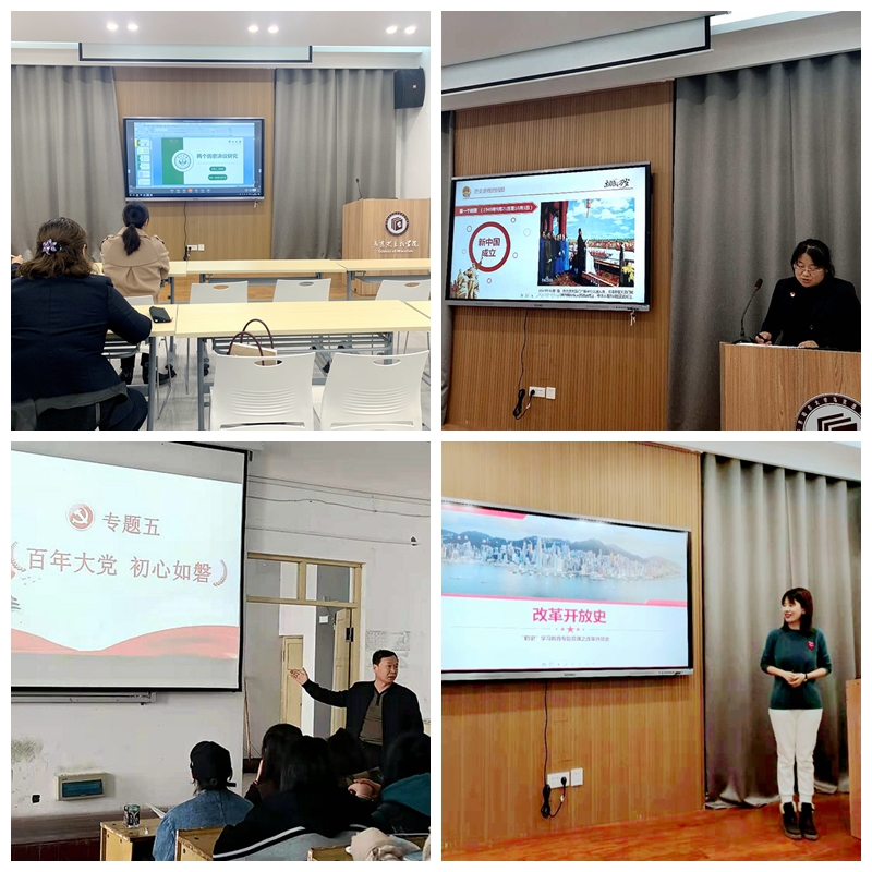 2020年以來,馬克思主義學院結合“三會一課”,開展了系列“四史”集中學習。以支委會設定議題討論學,黨員大會集中學,黨小組研討學,先后就黨的成立、兩個歷史決議、新中國史、改革開放史進行專題培訓學習。通過講黨史故事追憶崢嶸歲月,敘新中國史歌頌偉大成就,談改革開放史禮贊非凡業績,研社會主義發展史理清時空脈絡。以教師先學先會先行引導學生學會學懂學深。本學期,還在形勢與政策課中設置了“百年大黨 初心如磐”的專題,使黨史學習教育在課程上做到專題化、理論化、系統化、長期化。