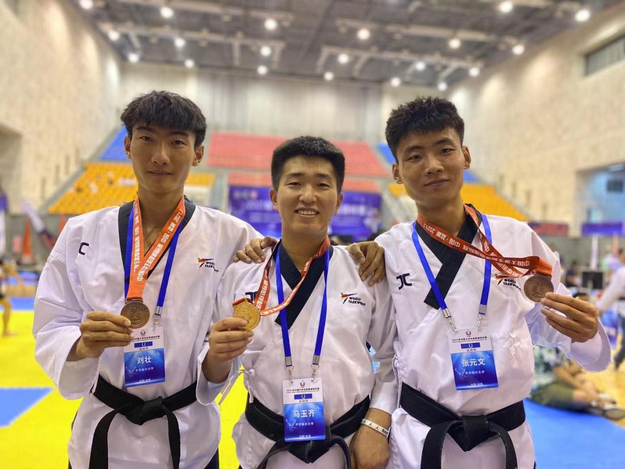 學校對此次大賽高度重視,由體育學院修月老師帶領9名學生參加此次國家級別賽事。經過五天激烈的賽場角逐,取得了1金、2銀、6銅的好成績。我校學生李揚獲得男子個人品勢金牌;楊子琪、馬玉齊兩名同學榮獲銀牌;王翹楚、蔣雪、單麗媛三名同學榮獲女子團體品勢銅牌;張元文、劉壯、石雋滔三名同學榮獲男子個人、團體銅牌;跆拳道舞獲得團體項目銅牌。并取得了高水平組團體總分第四的歷史性突破成績。