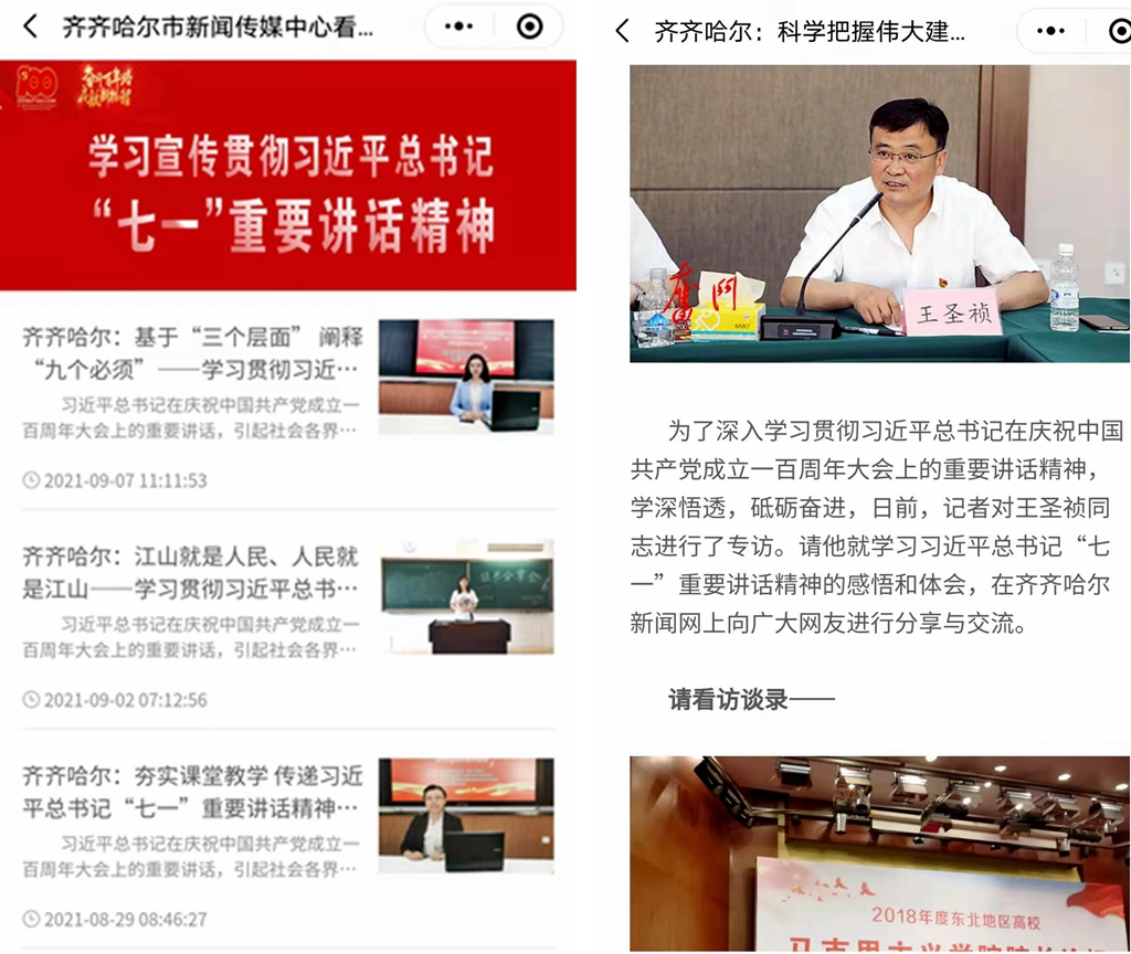 習近平總書記在慶祝中國共產黨成立一百周年大會上的重要講話,全面回顧了我們黨100年來團結帶領全國各族人民不懈奮斗走過的光輝歷程和作出的偉大歷史貢獻。使廣大人民置身于蕩氣回腸的奮斗過程,感慨所取得震古爍今的偉大成果。這是一份梳理黨向歷史和人民交出滿意答卷的“總結單”,是新時代立足中國實際不斷開創馬克思主義新境界的“指南針”,是共產黨人理想信念精神之鈣的“鑒定書”。我校馬克思主義學院與齊齊哈爾新聞網合作,以專欄形式推出了10篇學習貫徹習近平總書記“七一”重要講話精神系列訪談,累計閱讀達萬次。