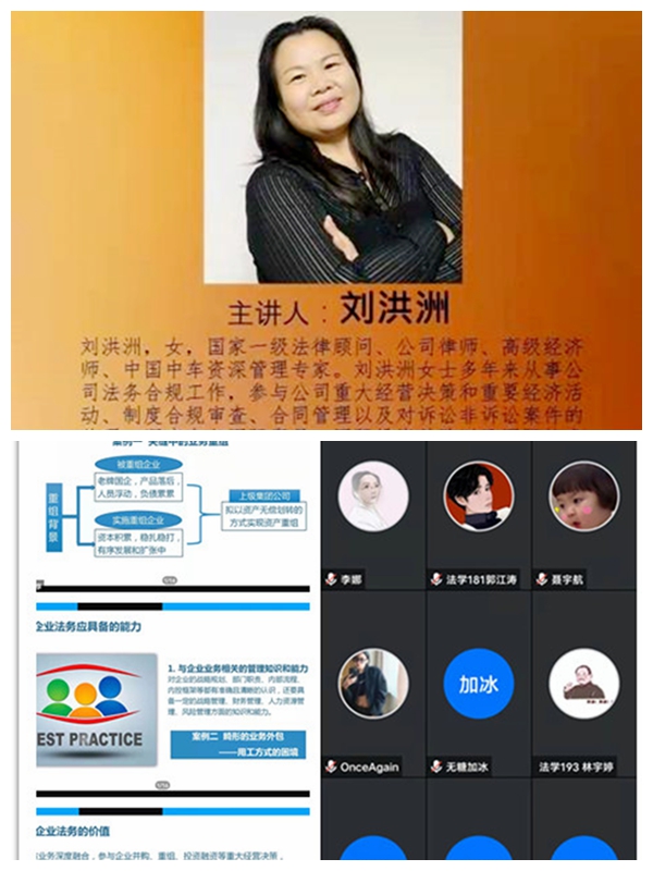10月20日,法學專業(yè)舉辦的“運用法治思維彰顯法務價值——企業(yè)經(jīng)營活動中法務實踐”線上專題講座。劉洪洲女士理論聯(lián)系實際,為法學專業(yè)師生展現(xiàn)了作為一個大企業(yè)的法律顧問需要具有整體思維和多維度解決問題的能力。