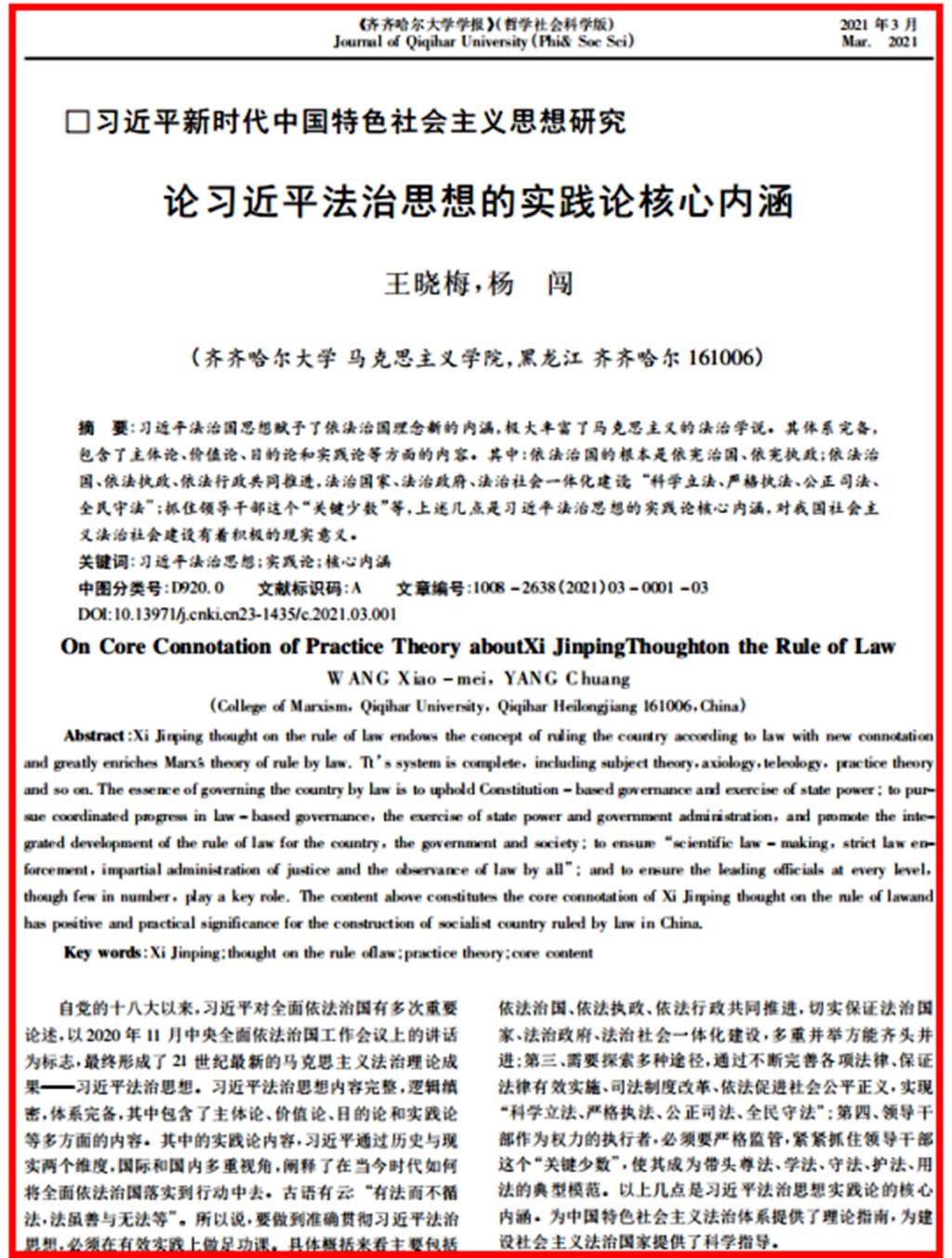 學思踐悟,細照篤行。學校黨委高度重視學習宣傳貫徹習近平法治思想。習近平法治思想是馬克思主義法治理論同中國實際相結合的最新成果,是21世紀馬克思主義法治思想,是習近平新時代中國特色社會主義思想的重要組成部分,是全面依法治國的根本遵循和行動指南,深刻回答了為什么要全面依法治國、怎樣全面依法治國這個重大時代課題。校、院兩級黨委將習近平法治思想的學習納入黨委理論學習中心組學習計劃、納入教職工政治理論學習計劃,組織廣大師生員工充分利用“學習強國”“黑龍江教育干部網(wǎng)絡學院”等網(wǎng)絡平臺等多種形式,學深悟透習近平法治思想,深刻領會其重大意義、精神實質、實踐要求,學懂弄通《法治中國建設規(guī)劃(2020—2025年)》把習近平法治思想融入教學體系。自2021年9月開始,將“習近平法治思想概論”納入了2021級法學專業(yè)基礎必修課,做好進教材、進課堂、進頭腦工作。加強習近平法治思想的理論研究和闡釋,發(fā)表《論習近平法治思想的實踐論核心內涵》等論文;在齊齊哈爾市“學習貫徹習近平法治思想”主題征文活動中,我校師生榮獲一等獎、三等獎各1篇。推動習近平法治思想入腦入心、走深走實,不斷增強法治意識,提高法治能力水平。