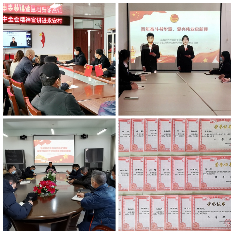 為深入推進學習黨的十九屆六中全會精神走深走實,實現全會精神解讀全覆蓋,學校各二級單位黨委、直屬黨支部在全會召開后第一時間組織全體黨員以中心組專題學習、理論學習讀書班、專題黨課等形式對黨的十九屆六中全會精神進行了學習;學校各民主黨派、團體也積極開展了座談研討活動,民主黨派團體成員紛紛撰文談感受,表示要以黨的十九屆六中全會精神為指引,做好本職工作,畫好最大同心圓。經過評審,投稿文章共評選出一等獎8篇,二等獎8篇,三等獎7篇;校團委組織“青年學生黨的創新理論宣講團”開展了黨的十九屆六中全會精神專題宣講,“學生自己講”的宣講方式激起了同學們學習黨的創新理論的熱情,宣講結束后,我校青年學生代表們紛紛表示,要在深入學習新時代黨的創新理論最新成果中,不斷增強聽黨話、跟黨走的思想自覺和行動自覺,以昂揚向上的精神風貌迎接黨的二十大勝利召開。為深化新時代文明實踐中心共建共創,校黨委宣傳部副部長何強教授受邀為拜泉縣上升鄉永安村黨員群眾做了黨的十九屆六中全會精神線上專題輔導宣講,宣講報告主題鮮明、內容豐富、數據詳實,拜泉縣委宣傳部以《駐永安村工作隊 讓創新理論走入基層百姓家》為題對此進行了專題報道。