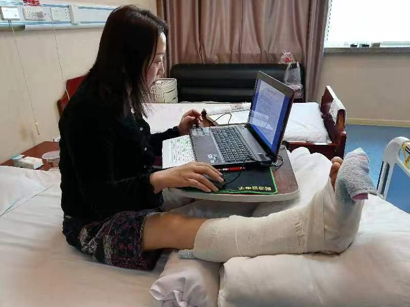 今年三月中旬,王莉娟老師被醫(yī)院確診為右腿腳踝骨粉碎性骨折,必須住院手術(shù)治療。家人擔(dān)心影響她身體康復(fù),反復(fù)勸說她同意同事幫她代課,可她卻毅然決然選擇了在病床上堅(jiān)持為同學(xué)們線上授課。由于在腳部植入了鋼釘、鋼板,外面還要戴著厚重的石膏夾板,上課時(shí)她的腿需要一直抬高,酸麻難忍,在身體極度不適的情況下,王莉娟老師認(rèn)真上好了每一堂課,沒有絲毫松懈,一次都沒有耽誤教學(xué)。同學(xué)們每每看到她大汗淋漓的樣子,都像家人一樣倍感心痛,紛紛在公屏上為她點(diǎn)贊致謝。可她卻笑著說,這沒什么,不是有一句話叫“共產(chǎn)黨員輕傷不下火線”嘛!