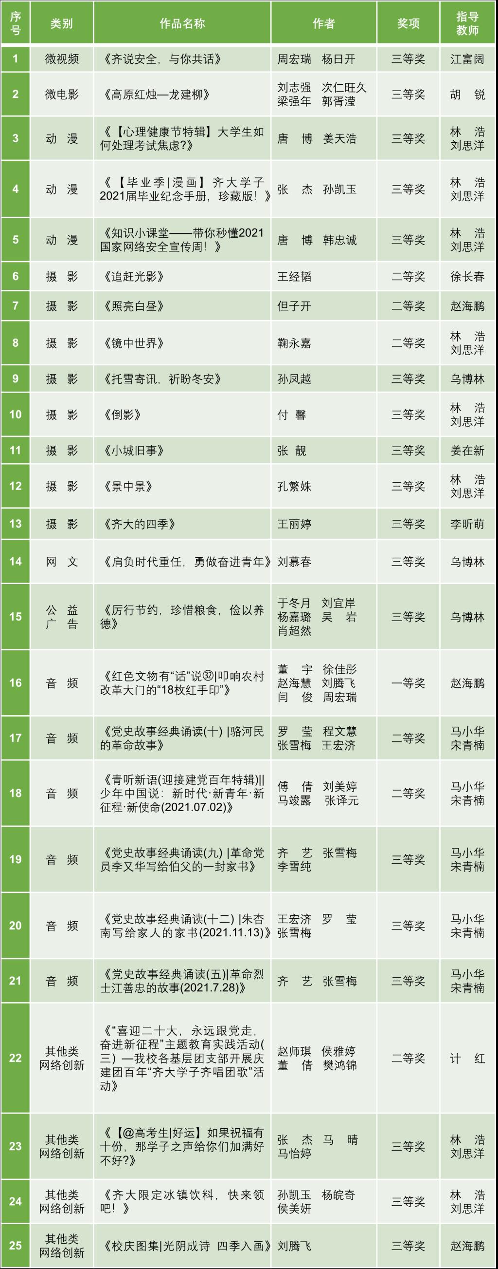 我校25項作品在第六屆“全省大學生網絡文化節”獲獎,分別是一等獎1項,二等獎6項,三等獎18項。其中,由播主202董宇、制藥201徐佳彤、工管202趙海慧、環藝201劉騰飛、計應202閆俊、機械201周宏瑞等六名同學錄制的音頻作品《紅色文物有話說丨扣響農村改革大門的“18枚紅手印”》獲全省一等獎;由宣傳部郭超、李昕萌老師提交的作品《聽紅歌· 學黨史:探索新媒體時代高校思想政治教育新形勢》獲得“全省高校網絡教育優秀作品推選展示活動”優秀工作案例二等獎。獲獎作品數量和質量較前幾屆均有新的突破,充分展現我校在繁榮網絡文化、推進高校網絡思政育人工作上取得的成效。
