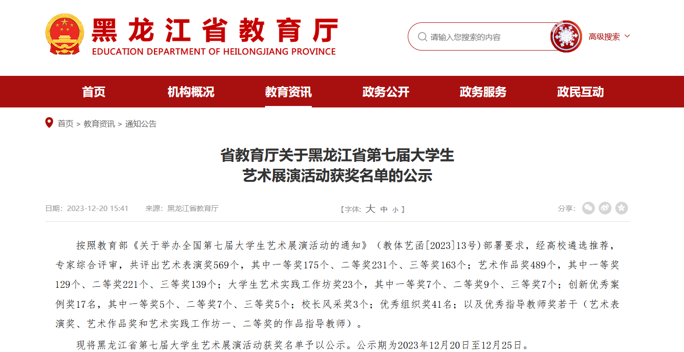 近日,由黑龍江省教育廳主辦的全省第七屆大學生藝術展演活動評選結果揭曉。我校參賽項目成績優異,共上報參賽作品68項,獲獎63項,其中一等獎29項,二等獎25項、三等獎9項,獲獎數量、層次均有新突破,是我校文化育人實踐成果的生動體現。