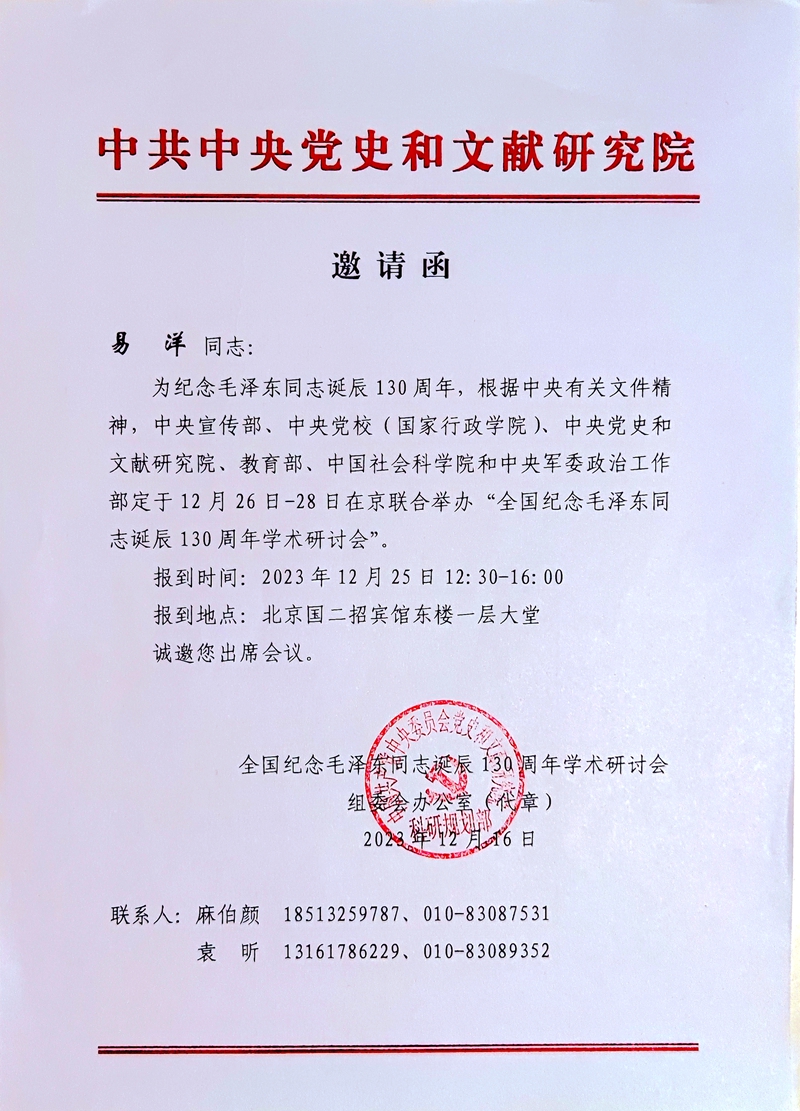 為紀念毛澤東同志誕辰130周年,深切緬懷毛澤東同志的豐功偉績,傳承弘揚毛澤東同志的光輝思想和崇高精神風范,根據中央有關文件精神,12月26日至28日,由中央宣傳部、中央黨校(國家行政學院)、中央黨史和文獻研究院、教育部、中國社科院和中央軍委政治工作部聯合舉辦的“全國紀念毛澤東同志誕辰130周年學術研討會”在北京舉行,中共中央政治局常委、中央書記處書記蔡奇出席開幕式并講話。我校馬克思主義學院王永明教授、思想政治教育專業碩士研究生易洋同學撰寫的論文《民主監督與自我革命——歷史周期率的破解之道》成功入選全國紀念毛澤東同志誕辰130周年學術研討會,易洋同學作為入會論文作者應邀參加了本次高水平學術研討會。