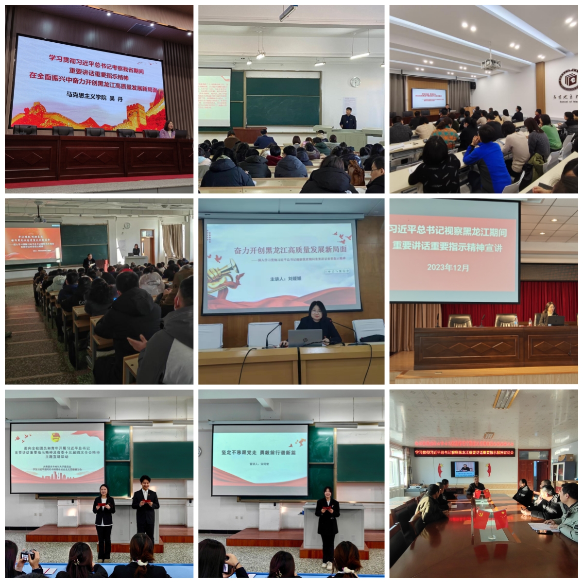 立時代之潮頭,發思想之先聲。為全面深入學習宣傳貫徹習近平總書記視察我省期間重要講話重要指示精神,教育引導全校師生員工錘煉“扎扎實實、踏踏實實、求真務實”的優良作風,切實把思想和行動統一到習近平總書記重要講話重要指示精神上來,按照學校相關文件部署安排,我校第一時間遴選黨員干部、專家學者、思政教師、學生骨干,組建了習近平總書記視察我省期間重要講話重要指示精神專家宣講團、青年學生宣講團和齊齊哈爾大學駐永安村宣講小分隊。2023年12月以來,我校習近平總書記視察我省期間重要講話重要指示精神宣講團成員深入黨員干部、師生和基層群眾,以對象化、分眾化、互動化的方式開展了一系列學習宣講活動,形成了“黨員干部帶頭講、專家學者深入講、青年學生自己講、深入基層群眾講”的生動局面,掀起了學習宣傳貫徹習近平總書記視察我省期間重要講話重要指示精神的熱潮。