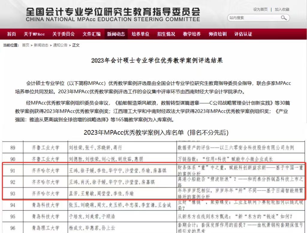 5月8日,全國會計專業(yè)學(xué)位研究生教育指導(dǎo)委員會正式公布2023年MPAcc(會計碩士)優(yōu)秀教學(xué)案例入庫名單。經(jīng)評選,全國共有165篇教學(xué)案例入選國家?guī)欤邶埥∮?篇入選,其中我校3篇,分別為經(jīng)濟與管理學(xué)院王鴻教授團隊編寫的《財務(wù)體系“重”中之重,賦能科創(chuàng)新益求新——基于中國一重的案例分析》《離港小船能否“劈波斬浪”?——和而泰分拆鋮昌科技上市之路》、孟芳副教授團隊編寫的《年年歲歲花相似,歲歲年年“所”不同——基于日海智能頻繁換所的案例分析》。
