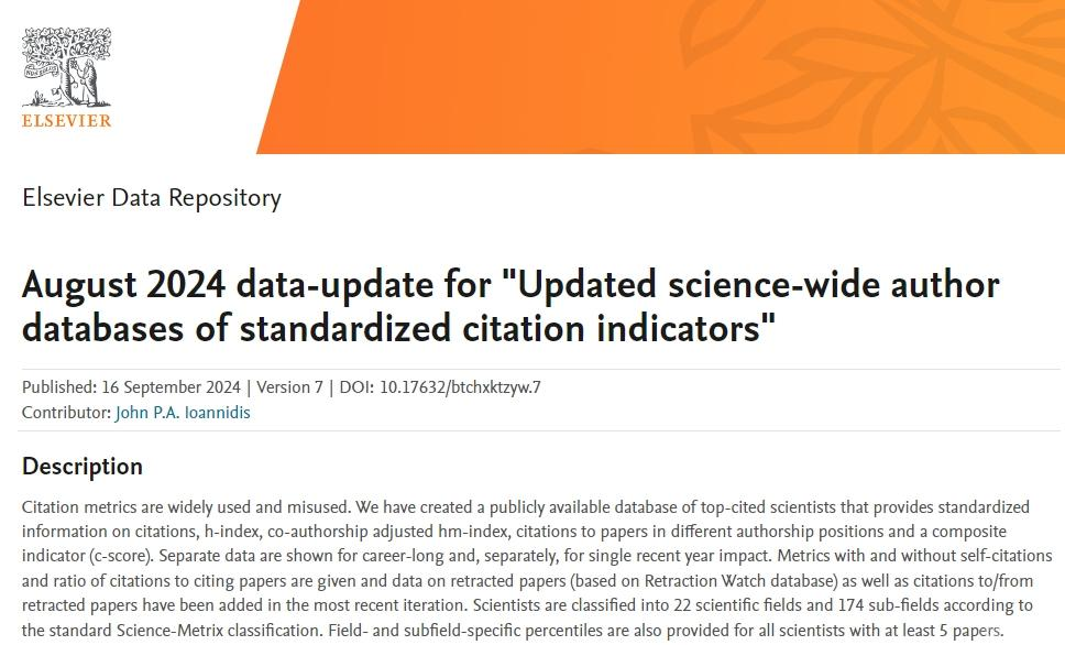該榜單是斯坦福大學(xué)John P. A. Ioannidis教授團(tuán)隊(duì)與Elsevier的合作成果,榜單基于Scopus數(shù)據(jù)庫的引用數(shù)據(jù)系統(tǒng)分析,依據(jù)總引用量、Hirsch H-index、共同作者修正Schreiber Hm-index、單獨(dú)作者、單獨(dú)或者第一作者以及單獨(dú)、第一或者最后作者文章引用量等六種指標(biāo)進(jìn)行綜合評(píng)定,從近700萬名科學(xué)家中遴選出世界排名前2%的科學(xué)家,分為22個(gè)領(lǐng)域和174個(gè)細(xì)分子領(lǐng)域。榜單提供了面向科學(xué)家長期科研表現(xiàn)的衡量指標(biāo),客觀真實(shí)反映科學(xué)家的學(xué)術(shù)影響力。