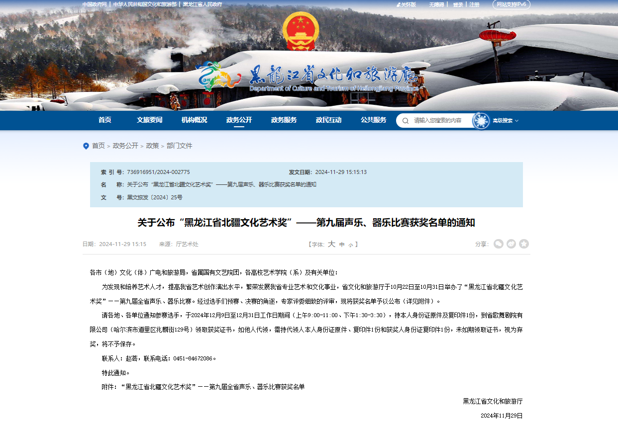 近日,黑龍江省文化和旅游廳下發了關于“黑龍江省北疆文化藝術獎”——第九屆全省聲樂、器樂比賽獲獎名單,我校師生在多個組別中獲獎。