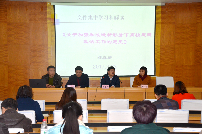 鄭喜群就中共中央、國務(wù)院印發(fā)的《關(guān)于加強和改進新形勢下高校思想政治工作的意見》中與學(xué)生工作緊密相關(guān)的內(nèi)容向與會同志進行了傳達和解讀。他表示,習總書記在點評“95后”大學(xué)生時指出:“他們朝氣蓬勃、好學(xué)上進、視野寬廣、開放自信,是可愛、可信、可為的一代。”這就要求我們做好思想政治工作,必須要充分了解我們的學(xué)生是什么樣的、他們在想什么、關(guān)注什么、希望什么。他強調(diào),做好高校思想政治工作,必須要堅持“立德樹人”根本原則,開展工作要因事而化、因時而進、因勢而新;必須要遵循思想政治工作規(guī)律,遵循教書育人規(guī)律,遵循學(xué)生成長規(guī)律;必須要樹立“圍繞學(xué)生、關(guān)照學(xué)生、服務(wù)學(xué)生”的新理念。