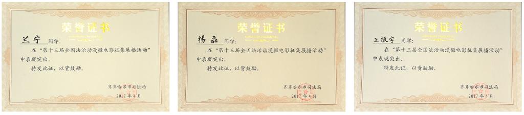 發布日期:2017-04-12 點擊量:4月11日,因在“第十三屆全國法治動漫微電影征集展播活動”中表現突出,我校蘭寧、楊磊、王振宇等17名同學,楊超、陳光、王世發3位指導教師獲齊齊哈爾市司法局表彰。