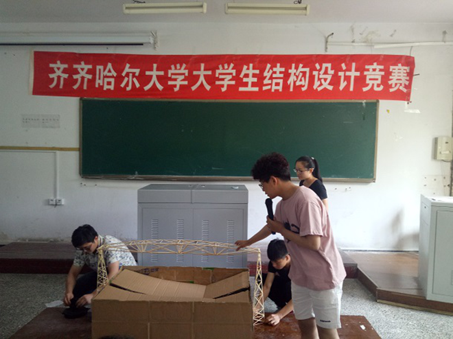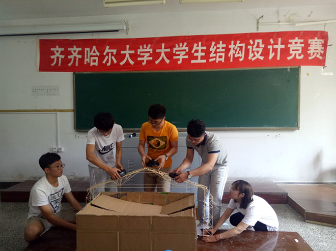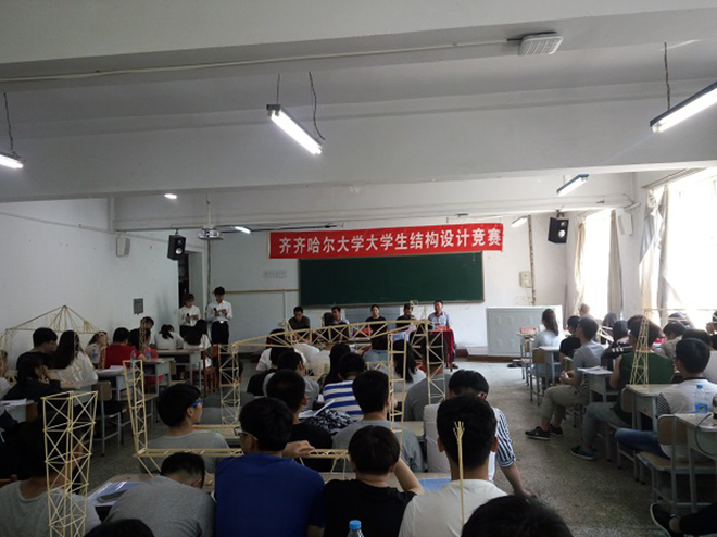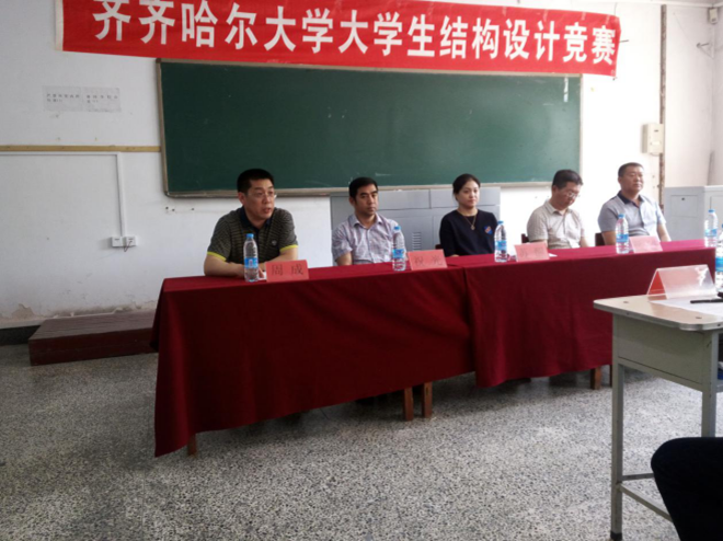 為培養(yǎng)我校大學(xué)生的工程創(chuàng)新、團(tuán)隊(duì)協(xié)作和實(shí)踐能力,加強(qiáng)專業(yè)知識(shí)與工程實(shí)踐的結(jié)合,同時(shí)也為了響應(yīng)黑龍江省教育廳下發(fā)的結(jié)構(gòu)設(shè)計(jì)競(jìng)賽通知,6月14日下午,由建筑與土木工程學(xué)院承辦的齊齊哈爾大學(xué)結(jié)構(gòu)設(shè)計(jì)大賽在3教206室舉行。校團(tuán)委副書記蘇醒、校教學(xué)實(shí)驗(yàn)設(shè)備管理中心副主任祝文生、校教務(wù)處副處長祝光、建筑與土木工程學(xué)院黨委書記樊友才、院長周成出席了本次比賽。競(jìng)賽評(píng)委由建筑與土木工程學(xué)院副院長張道明、土木工程專業(yè)系主任呂春、機(jī)電工程學(xué)院理論力學(xué)教研室孟凡弘、土木工程專業(yè)教師王蕊、王洪志組成。