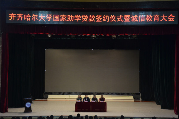11月14日下午,我校在中區俱樂部舉行哈爾濱銀行國家助學貸款簽約儀式暨誠信教育大會。華安保險黑龍江分公司信用保證險事業部綜合管理室主任麻世銳,我校國家助學貸款工作領導小組副組長、學生工作部(學生處)部(處)長姜波,國家助學貸款工作領導小組辦公室副主任、財務處副處長寧國祥出席了簽約大會。我校學生工作部(學生處)相關人員、各學院負責貸款的輔導員、華安保險黑龍江分公司工作人員及我校此次申請國家助學貸款的700余名學生參加了大會。大會由學生工作部(學生處)副部(處)長張樹啟主持。
