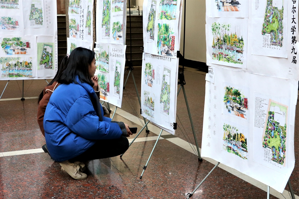 11月29日下午,齊齊哈爾大學第九屆園林設計大賽作品展在西區(qū)主樓一樓陽光大廳舉辦。副校長李英杰到展覽現(xiàn)場觀看作品,學生工作部(學生處)部(處)長姜波,生命科學與農(nóng)林學院黨委書記楊銘,生命科學與農(nóng)林學院副書記、副院長張培華以及園林系師生共同觀看了展覽。