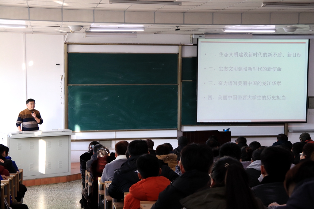 在西區1教階梯202教室,校黨的十九大精神宣講團成員、馬克思主義學院馬克思主義基本原理教研部主任、博士、碩士生導師王圣禎教授以《認真學習十九大生態文明新思想奮力譜寫美麗中國的龍江華章》為題,從生態文明建設新時代的新矛盾與新目標、生態文明建設新時代的新使命、奮力譜寫美麗中國的龍江華章、美麗中國與大學生的歷史擔當等方面進行了解讀。他指出,實現美麗中國偉大夢想,一要戰勝生態挑戰的偉大斗爭,二要建設生態馬克思主義政黨的偉大工程,三要推進中國特色社會主義生態文明建設偉大事業。緊密結合省情,在立足得天獨厚的龍江自然資源優勢中搶占綠色發展制高點,促進綠色發展。建設美麗中國更需要大學生的歷史擔當。體育學院全體教職工、學生黨員及入黨積極分子參加了宣講活動。