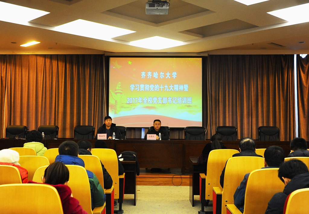 為全面學習貫徹落實黨的十九大精神,深刻領會習近平新時代中國特色社會主義思想的歷史地位和豐富內涵,12月14日上午,齊齊哈爾大學學習貫徹黨的十九大精神暨2017年全校黨支部書記培訓班在德潤大廈四樓會議室舉辦。全校各部門、各單位黨支部書記參加了培訓班。培訓活動由黨委組織部副處級組織員徐海祥主持。