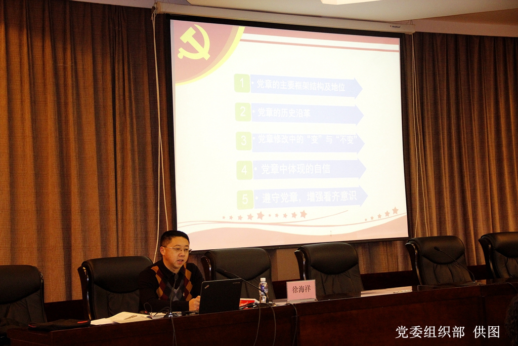 12月15日上午,黨委組織部副處級組織員徐海祥在培訓班上以《學習新黨章 增強看齊意識》為題,從黨章的主要框架結構及地位、黨章的歷史沿革、黨章修改中的“變”與“不變”、黨章中體現的自信、遵守黨章,增強看齊意識等五個方面,分享了自己學習黨的十九大修訂的《中國共產黨章程》的心得和體會。