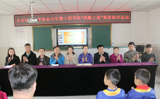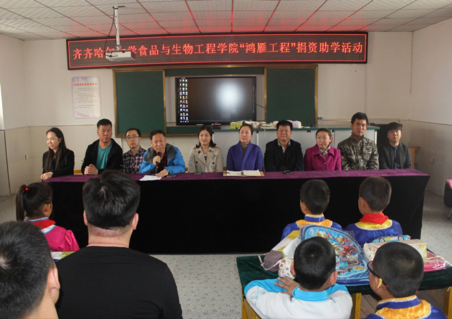 捐資助學儀式開始前,師生共同來到了哈拉達族小學的“鴻雁工程林”,并在這片食品學院與哈拉達族小學二十余年情感從未間斷的土地上植下了一棵棵“勵志樹”,這些小小的樹苗除了代表著友誼、愛心和奉獻以外,還代表了齊大師生所給予的希望與肩上的責任。
