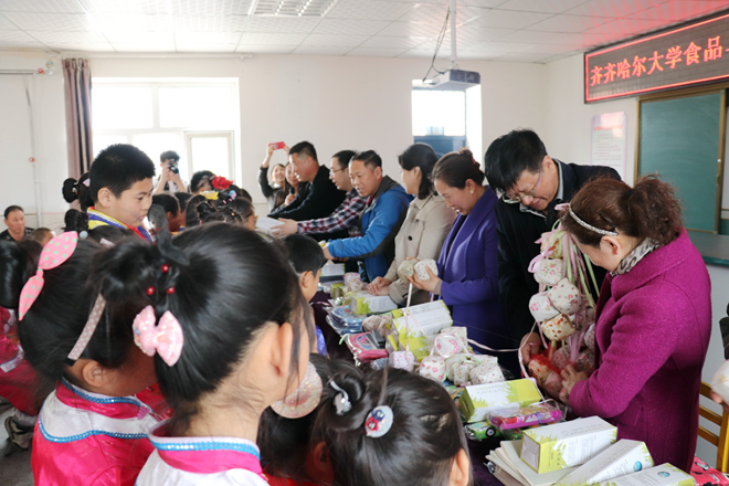 哈拉新村達族小學校長陳麗紅致辭,她先向我校師生的到來表示歡迎,并由衷地感謝我校師生多年來對哈拉達小學一如既往的關心、愛護、溫暖和幫助,尤其是對楊淳老師這二十余年來的辛勤付出與默默堅守表示由衷的敬意和感謝。“鴻雁工程”走過20年,已經從最初的“雛雁”成長為羽翼漸豐的“大雁”,這只“大雁”不僅包含了人員隊伍的不斷壯大,活動內容的逐漸豐富,活動內涵的不斷提升,更多的還是新老“鴻雁人”心手相牽結下的濃情厚意。如今,“鴻雁工程”桃李芬芳,香飄各地,大手牽小手,愛心頻傳遞,令“鴻雁人”驕傲與欣慰。“鴻雁工程”創立至今已經有400多名學生受益于齊大食品學院的關愛與幫助,帶著食品學院師生的溫暖和心意,小學生們一定會一路砥礪前行,奮力向前。陳校長細數鴻雁過往,感恩齊大食品學院,還誠摯的邀請我院師生常到哈拉達小學做客,共同感受鴻雁之美好。