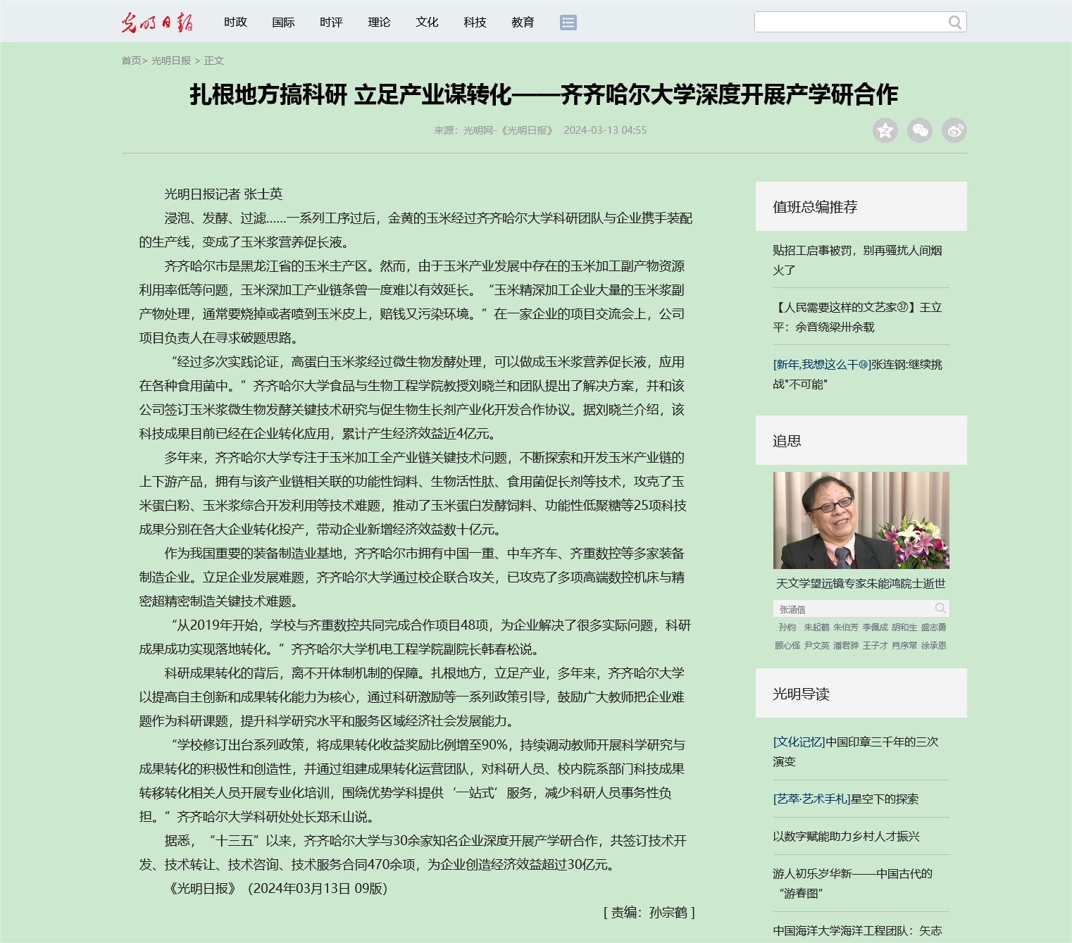 【光明日報】扎根地方搞科研 立足產(chǎn)業(yè)謀轉(zhuǎn)化——齊齊哈爾大學(xué)深度開展產(chǎn)學(xué)研合作