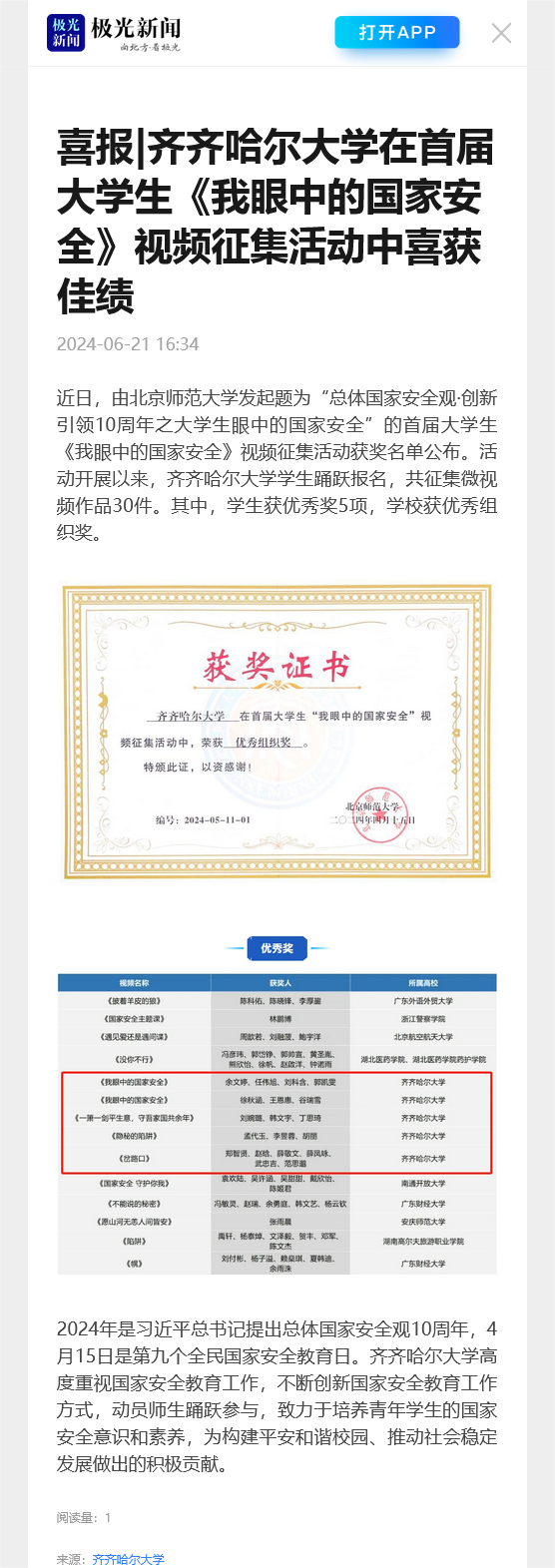 【極光新聞】喜報|齊齊哈爾大學在首屆大學生《我眼中的國家安視頻征集活動中喜獲全》佳績