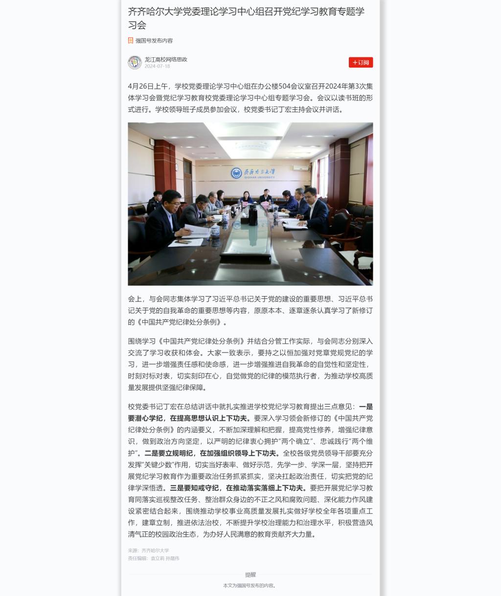 【學(xué)習(xí)強(qiáng)國】齊齊哈爾大學(xué)黨委理論學(xué)習(xí)中心組召開黨紀(jì)學(xué)習(xí)教育專題學(xué)習(xí)會(huì)