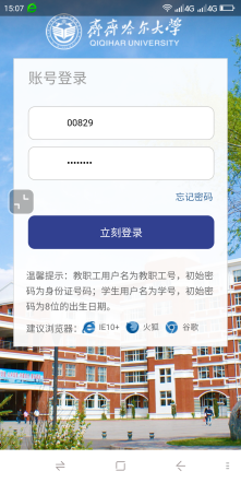 首先登陸齊齊哈爾大學主頁,在菜單欄點擊“智慧校園”出現登錄頁面(實際走的是WEBVPN)。(賬號是您的工號,初始密碼是您的WiFi密碼,登陸之后必須修改密碼,密碼要求:字母+數字+特殊符號)