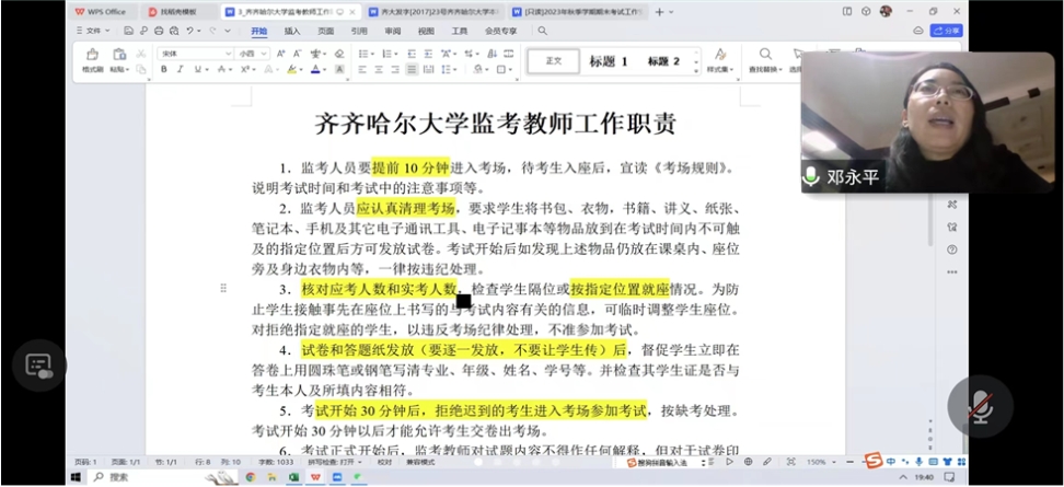 為順利完成本學期教學工作,安排布置期末考試工作,確保考試順利,規范試卷資料存檔,嚴明考試考場紀律,落實監考、巡考要求,12月21日19:30,我院線上召開了期末考試考務培訓會,本次會議由教學副院長鄧永平主持。